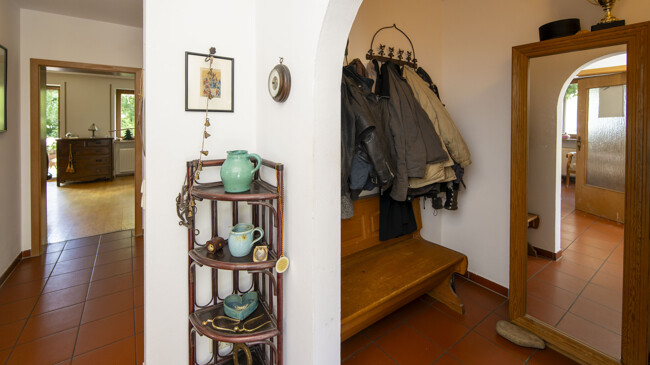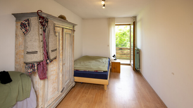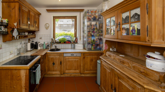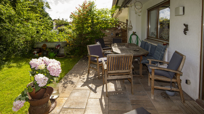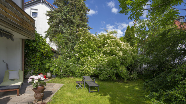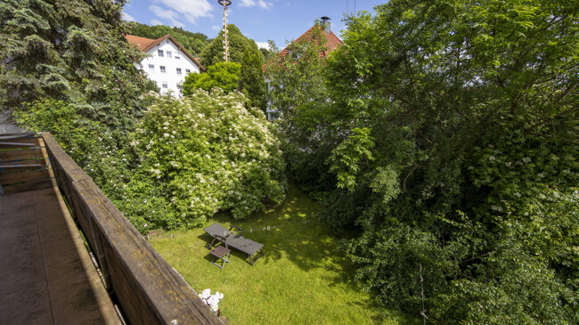 Und öffnet man im Sommer die Terassentür, erweitert sich der Wohnbereich in einen schönen, behaglichen Garten hinein. Gut eingewachsene Büsche und Bäumen umsäumen ihn und bieten heimeligen Sichtschutz und kühlenden Schatten an heißeren Tagen. Möchte man dort dann mit der Familie oder Freunden auch einmal spontan grillen, ist auch die schnell organisiert: In einem Metzgerautomaten gleich um die Ecke gibt es immer Nachschub an leckerer Bratwurst und frischem Fleisch.