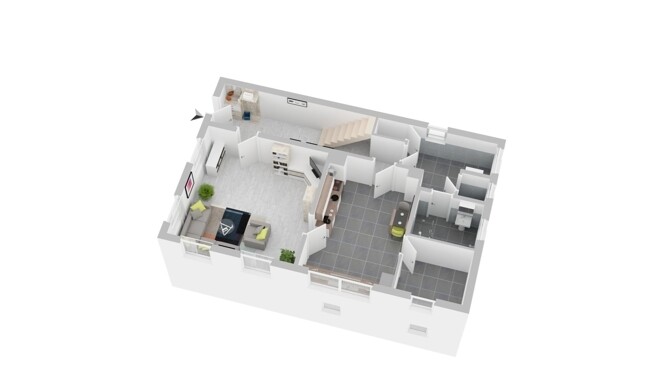 Die positive Energie dieser Umgebung reicht bis in das Bauernhaus hinein. Seine Zimmer sind lichtdurchflutet und die großen Fenster öffnen den Blick ins Freie. Zudem erfüllt der junge Baukörper moderne Standards: Die gut geschnittenen Räume sind hoch, Böden, Decken und ebenso die breite Treppe ins Obergeschoss sind aus dauerhaft solidem Beton. Überraschungen, wie etwa marodes Holz oder feuchte Wände gibt es hier nicht.