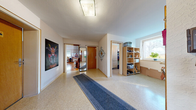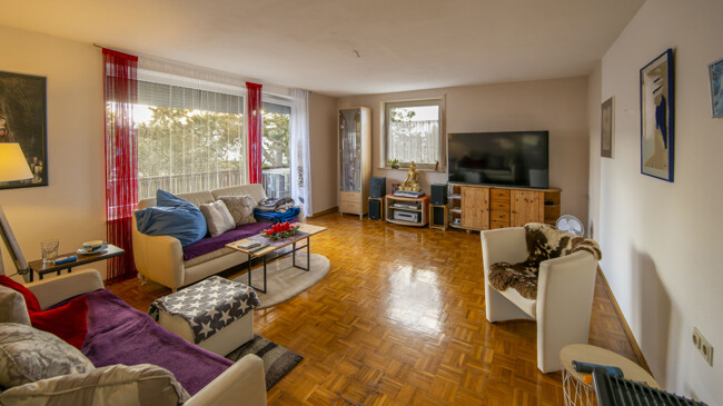 Was gleich auffällt in dem Zweifamilienhaus, sind die sehr hellen und großzügig geschnittenen Räume der beiden identischen Wohnungen mit je 110m². Selbst der einladend große Flur wird von viel Tageslicht durchflutet. Dies gilt auch für die geräumige Küche mit einem Essbereich für die ganze Familie. In beiden Wohnzimmern mit großer Fensterfront vermittelt das Mosaikparkett einen gediegen-anheimelnde Atmosphäre.