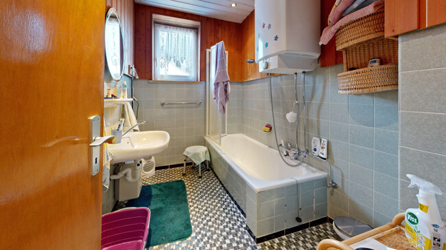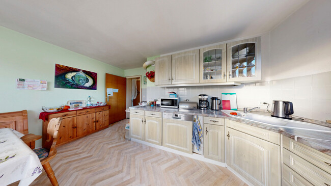 Die derzeit vermietete OG-Wohnung in einem freistehenden Zweifamilienhaus ist großzügig geschnitten. Was auf den ersten Blick auffällt: Alle Räume sind sehr hell. Selbst der einladende Flurbereich wird von viel Tageslicht durchflutet. Dies gilt auch für die große Küche mit einer Essecke für die ganze Familie. Im Wohnzimmer mit großer Fensterfront und einem Balkon davor vermittelt das gediegene Mosaikparkett eine-gehoben, anheimelnde Atmosphäre. Der Dachboden darüber kann zudem ausgebaut werden. In der Wohnung muss so einiges renoviert werden. Für Home- und Handwerker wird das Haus deshalb zu einem lukrativen Schnäppchen! Zu der Wohnung gehören auch Kellerräume und eine Garage.