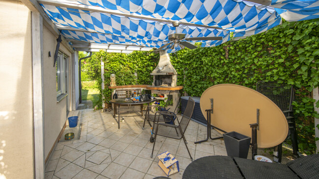 Wohnküche, einem Badezimmer sowie einer großen Terrasse mit gemauertem Pizzaofen – perfekt